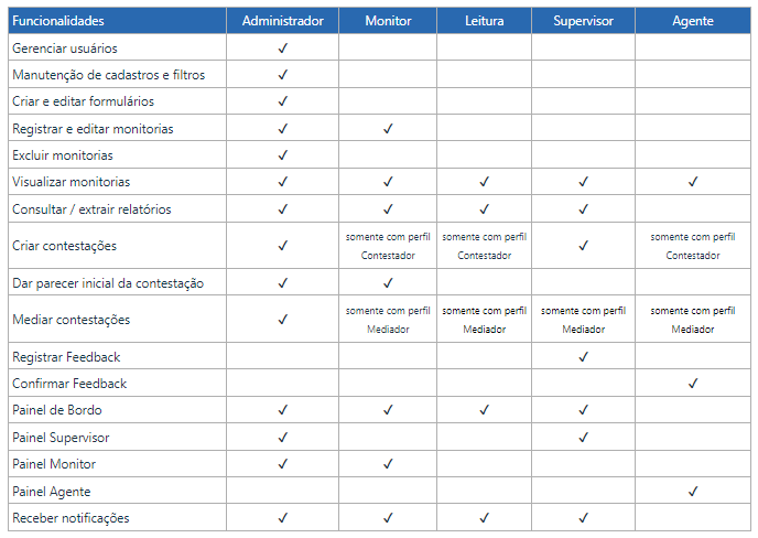 Os agentes são os usuários que serão avaliados, possuem acesso ao Painel do Agente para acompanhamento de suas monitorias e podem confirmar o recebimento do feedback.
