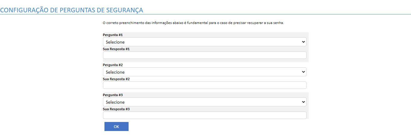 Você deverá selecionar e cadastrar respostas para 3 perguntas de segurança.