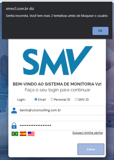 Se você fizer login no SMV usando uma senha que não corresponda à configurada em sua conta, verá a seguinte mensagem de erro: